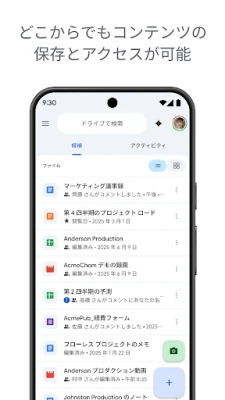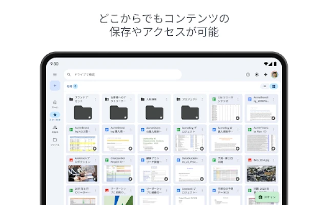 Google ドライブは、ファイルやフォルダを安全に保存し、効率的に整理できるクラウドストレージです。どのデバイスからでもアクセスし、共同編集でチーム作業を促進。場所を選ばない柔軟な働き方をサポートします。