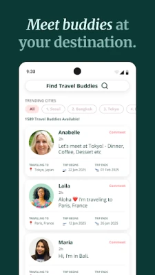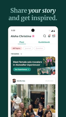 NomadHerのグローバルコミュニティでは、旅の体験や役立つヒントを分かち合い、世界中の女性たちと深い共感を築けます。ベテランも初心者も、仲間からのインスピレーションを見つけることができるでしょう。さらに、内蔵のメッセンジャー機能を使えば、現在地周辺の女性旅行者や地元の方々と簡単に出会い、チャットを楽しむことが可能。新たな友情を育み、忘れられない思い出を共に作り、旅をより豊かなものにしてください。