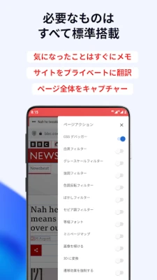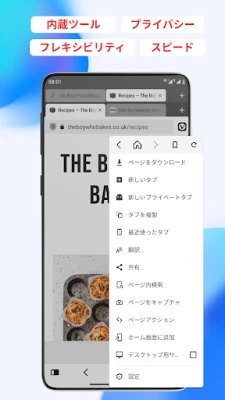 Vivaldi は単なるブラウザの枠を超え、効率的なワークフローを支える強力なツール群を内蔵しています。直感的なタブ管理機能を使えば、開いているタブも、プライベートタブも、最近閉じたタブも、同期されたタブも、スワイプ一つで自在に切り替え可能。アプリの切り替えで集中が途切れることはもうありません。Lingvanex社提供の翻訳機能でシームレスに多言語コンテンツにアクセスし、ウェブページから直接メモを記録、スクリーンショットも手軽に保存できます。お気に入りのサイトにはスピードダイヤルから瞬時にアクセスし、検索エンジンもニックネームで素早く切り替えられるため、貴重な時間を無駄にしません。