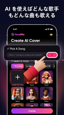VocalMe 音楽:AIによるカバーソングで、あなたの音楽体験を革命的に変えましょう。お気に入りの楽曲をAIが鮮やかに生まれ変わらせ、まるでプロが創り出したようなハイクオリティなカバーソングを簡単に実現します。無限の創造性を解き放ち、AI技術が織りなすパーソナルな音楽の世界へ没頭してください。